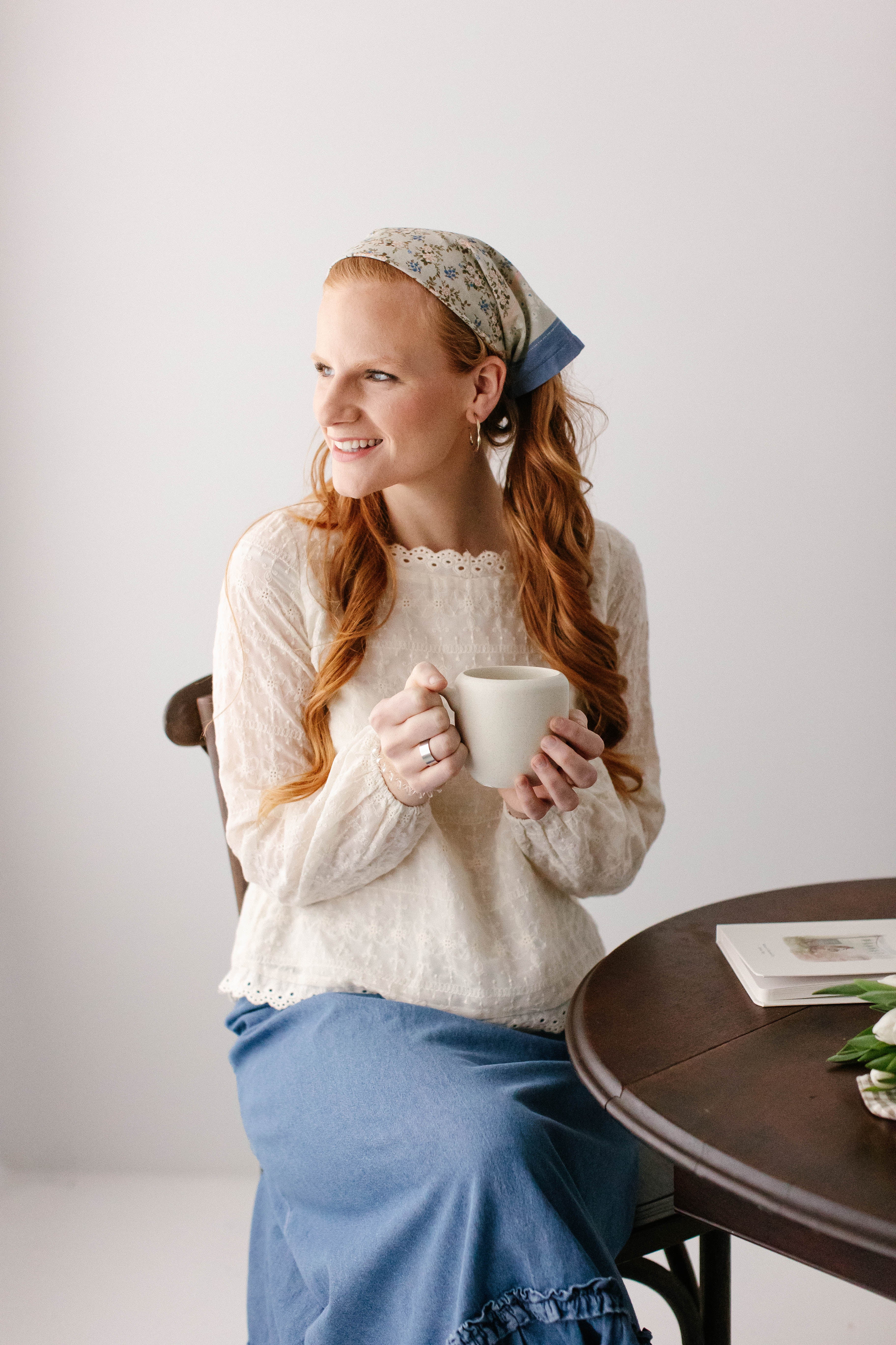 Model wearing the 'Victoria' Embroidered Lace Top with the 'Sheridan' Stretch Denim Skirt in Vintage Wash (coming soon!)