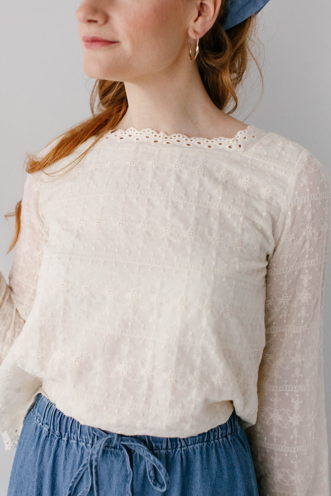 The perfect staple pieces are ones that can elevate an outfit with ease! The 'Victoria' Embroidered Lace Top features delicate embroidered lace detailing in a vintage cream color, a modest eyeleted square neckline and eyelet detailing on the hem, is 100% cotton, and has a fully lined bodice. Pair the ‘Victoria’ with any of your favorite denim, tiered, or pleated skirts for the cutest outfit for a day out. Exclusively designed by us with you in mind.