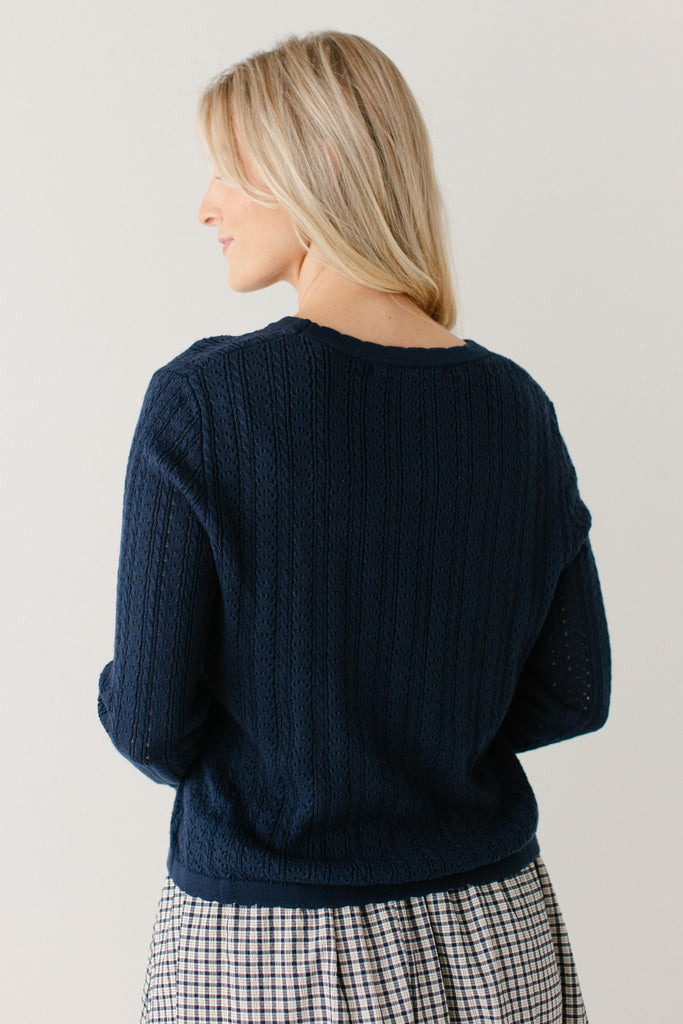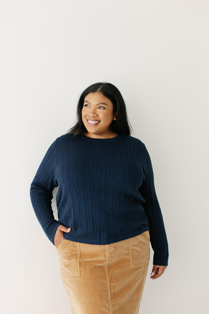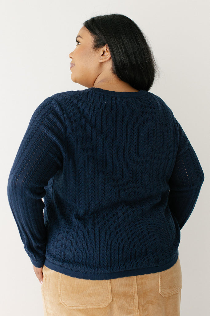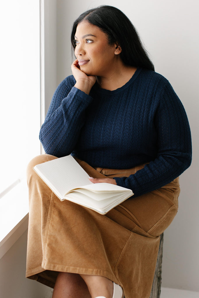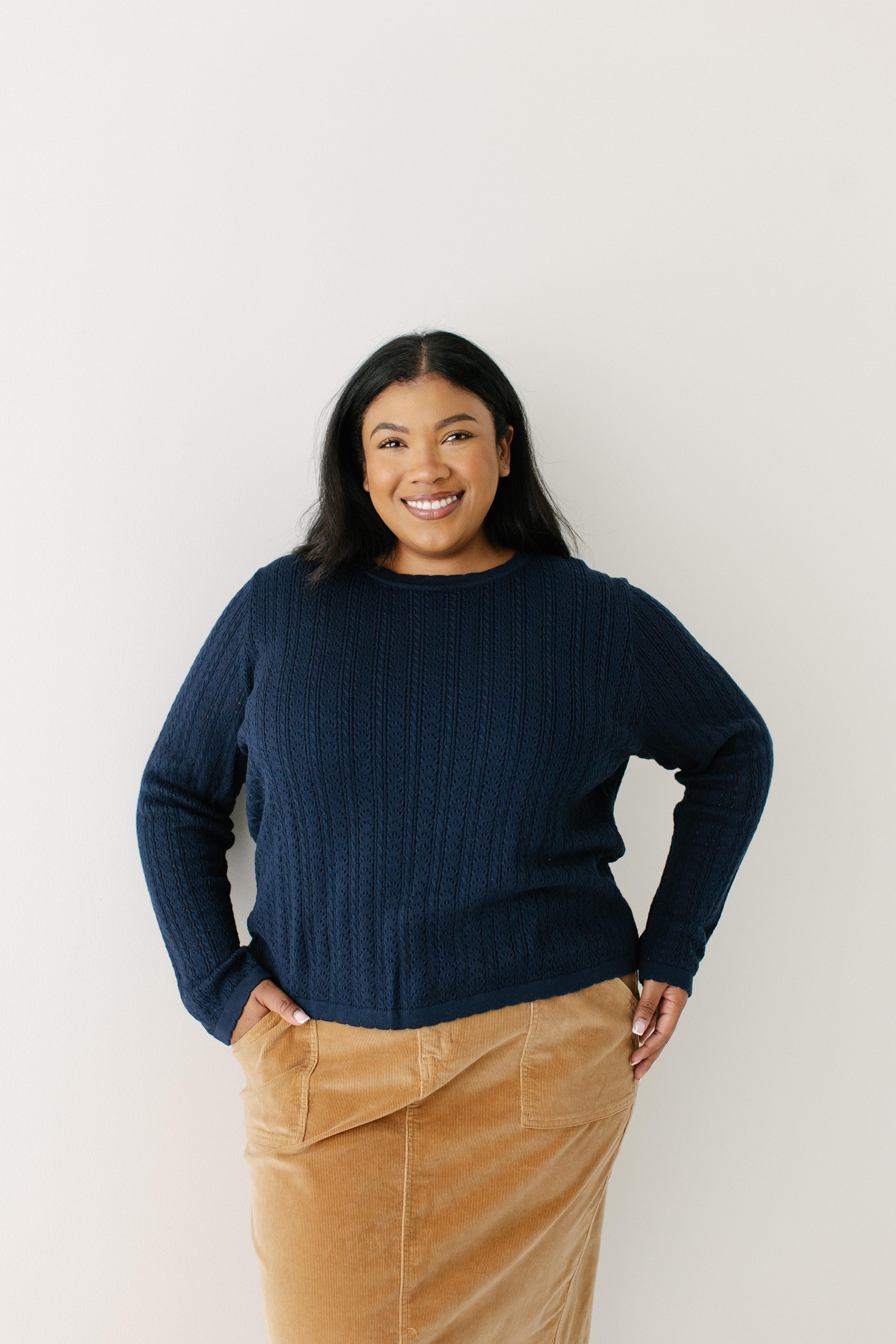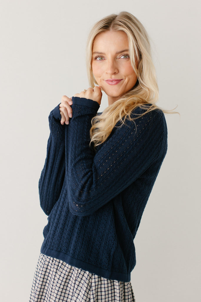 The perfect dainty sweater with all the fun details! The ‘Waverly’ Pointelle Sweater is designed to keep you classy and confident all winter long, with the prettiest pointelle detailing, versatile navy color, and lined bodice. Pair this sweater with your favorite neutral or print skirt, or wear under a pinafore dress for the cutest ensemble for a girls’ day out. Exclusively designed by us with you in mind.