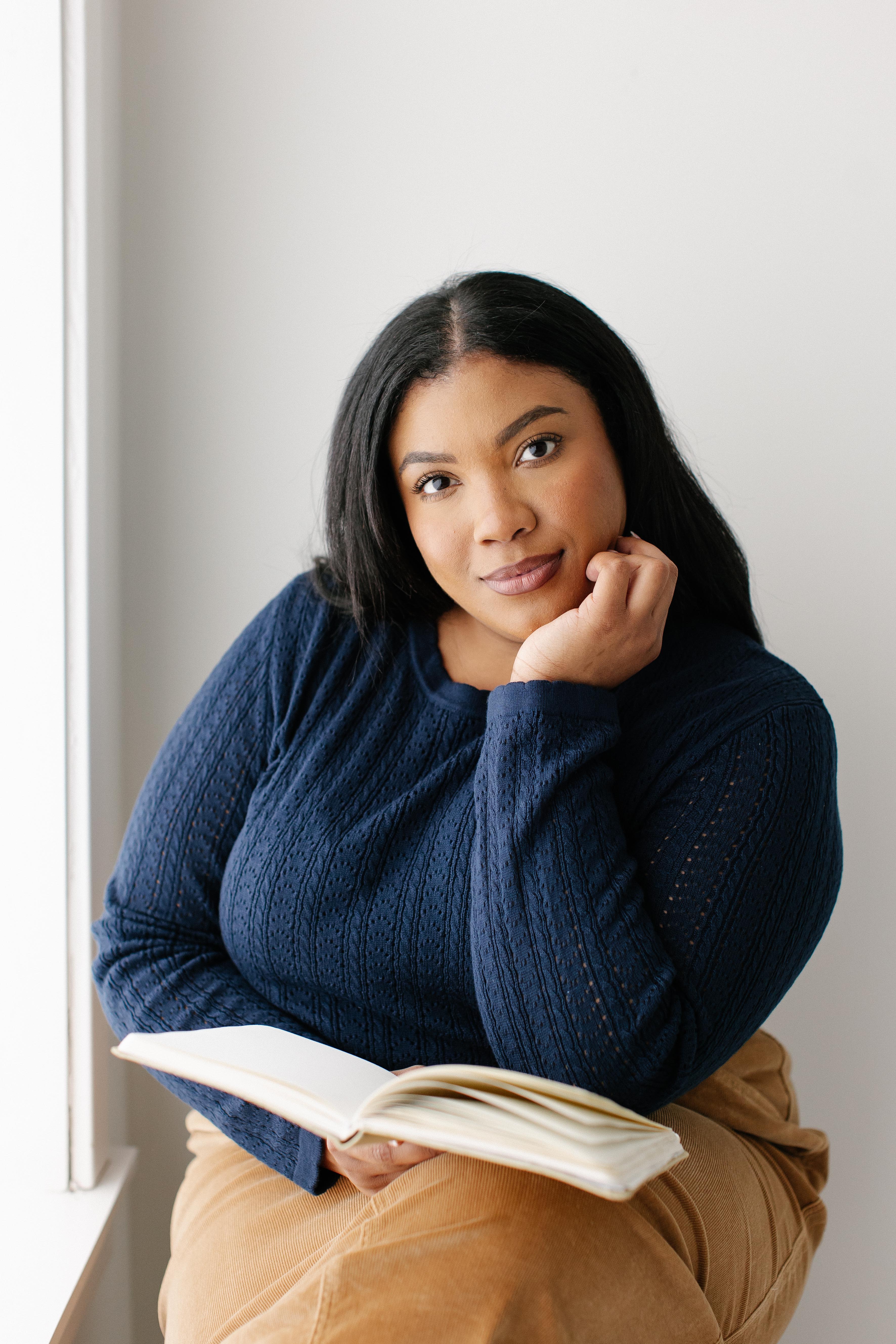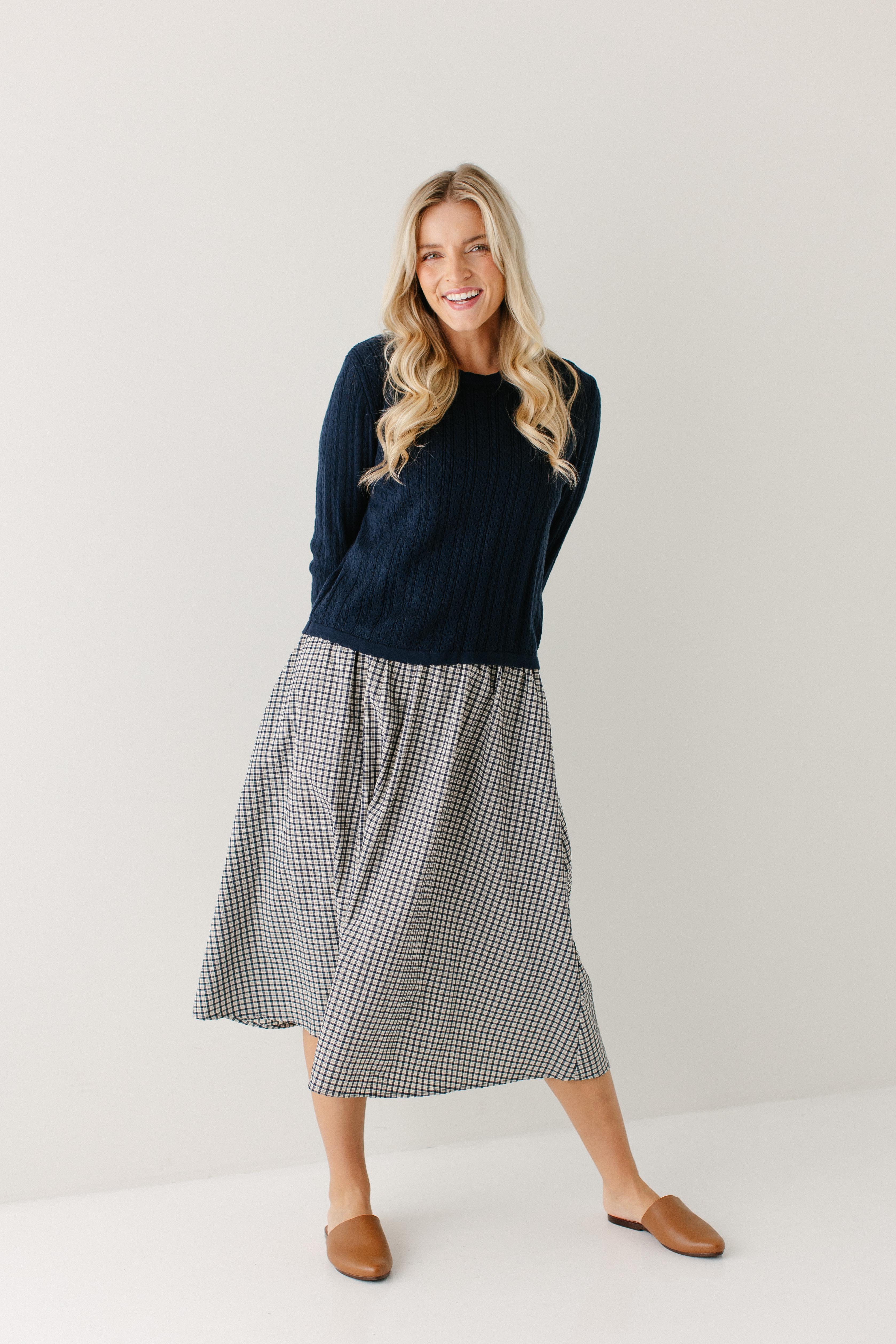 Model wearing the 'Waverly' Pointelle Sweater with the 'Candace' Navy Plaid A-Line Midi Skirt