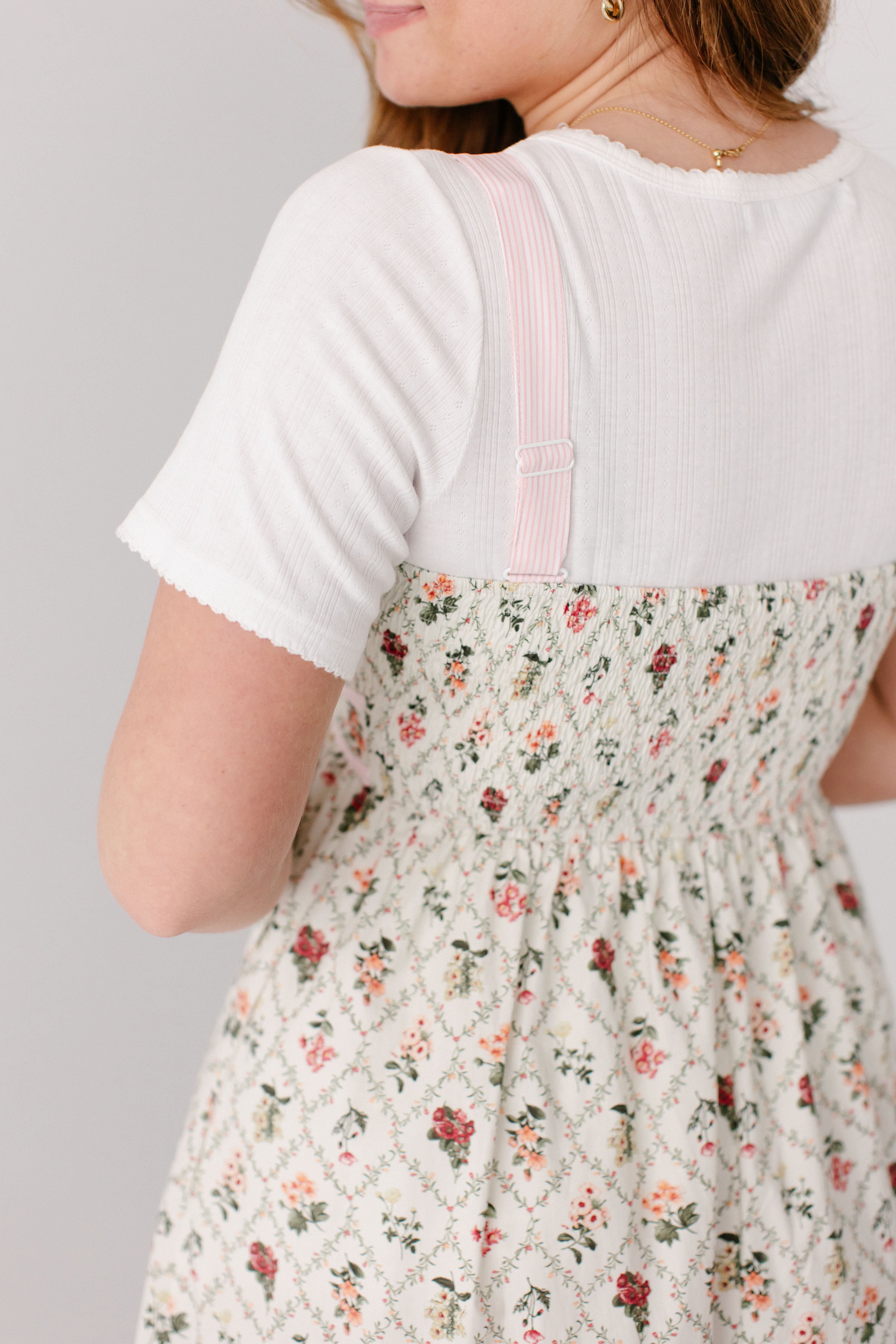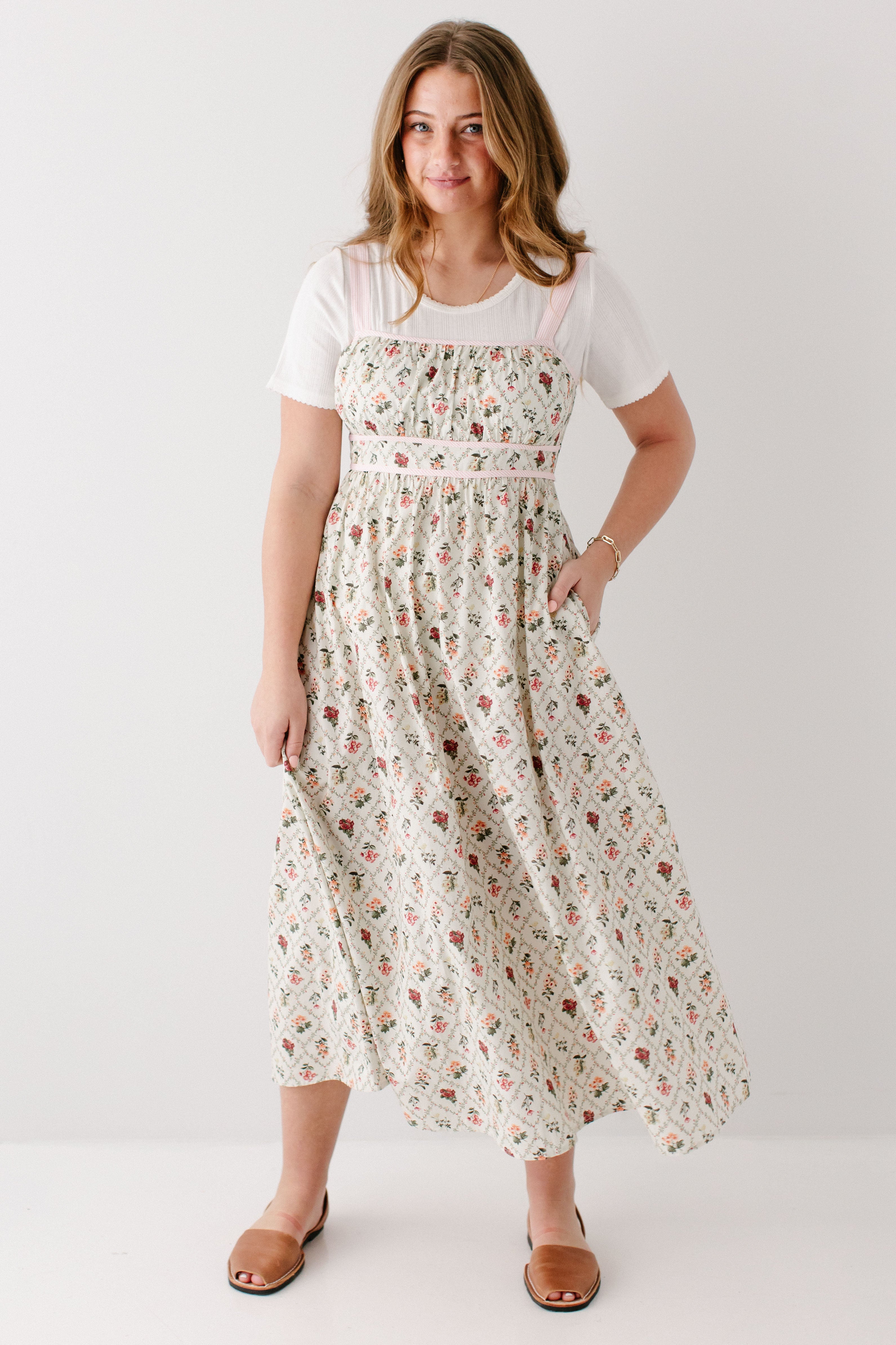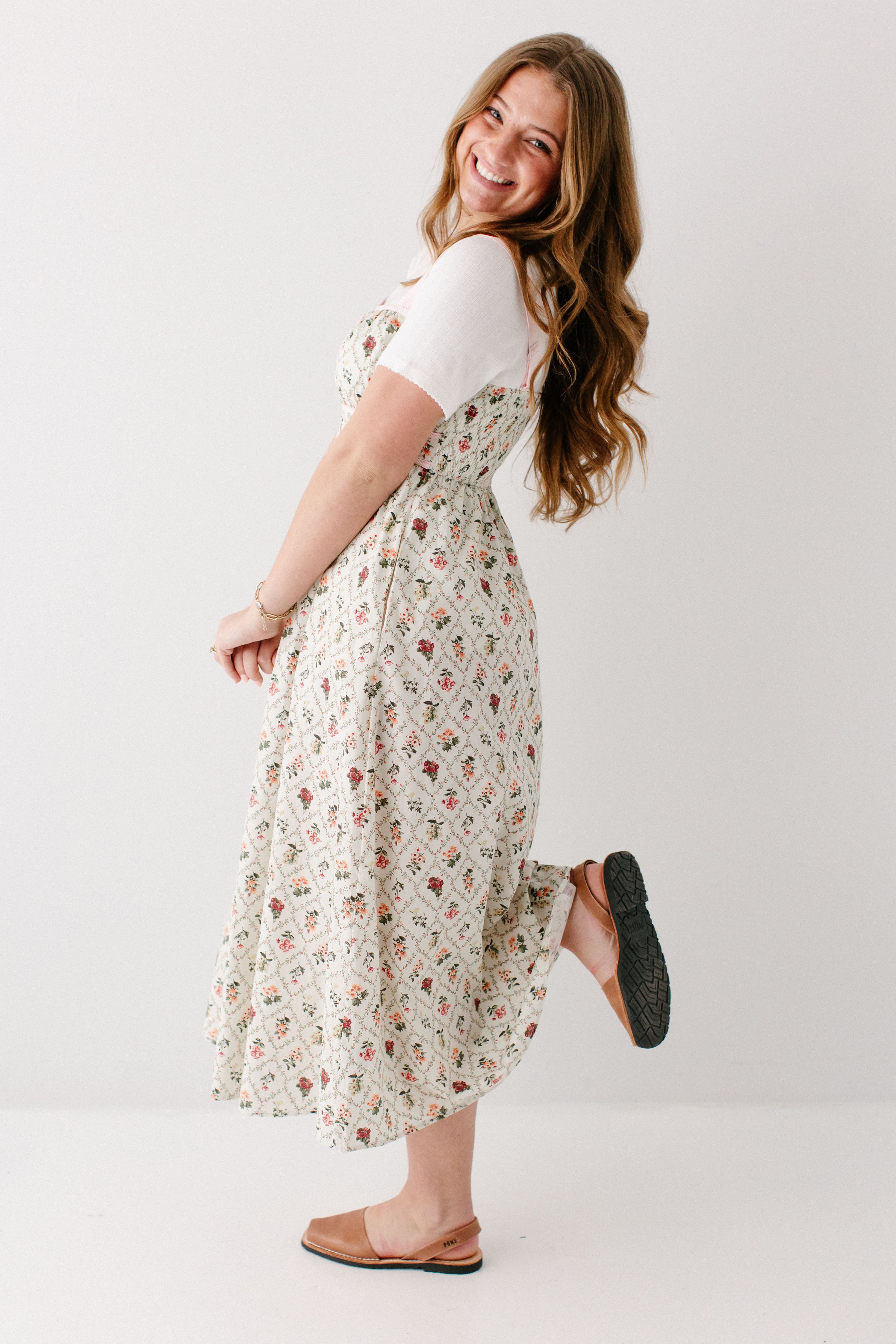 Model wearing the 'Mia' Pointelle Knit Top in Soft White layered under the 'Wildflower' Floral Pinafore Maxi Dress