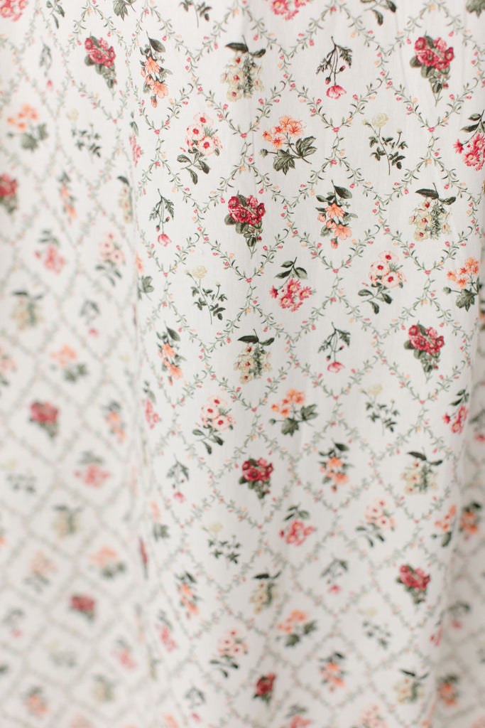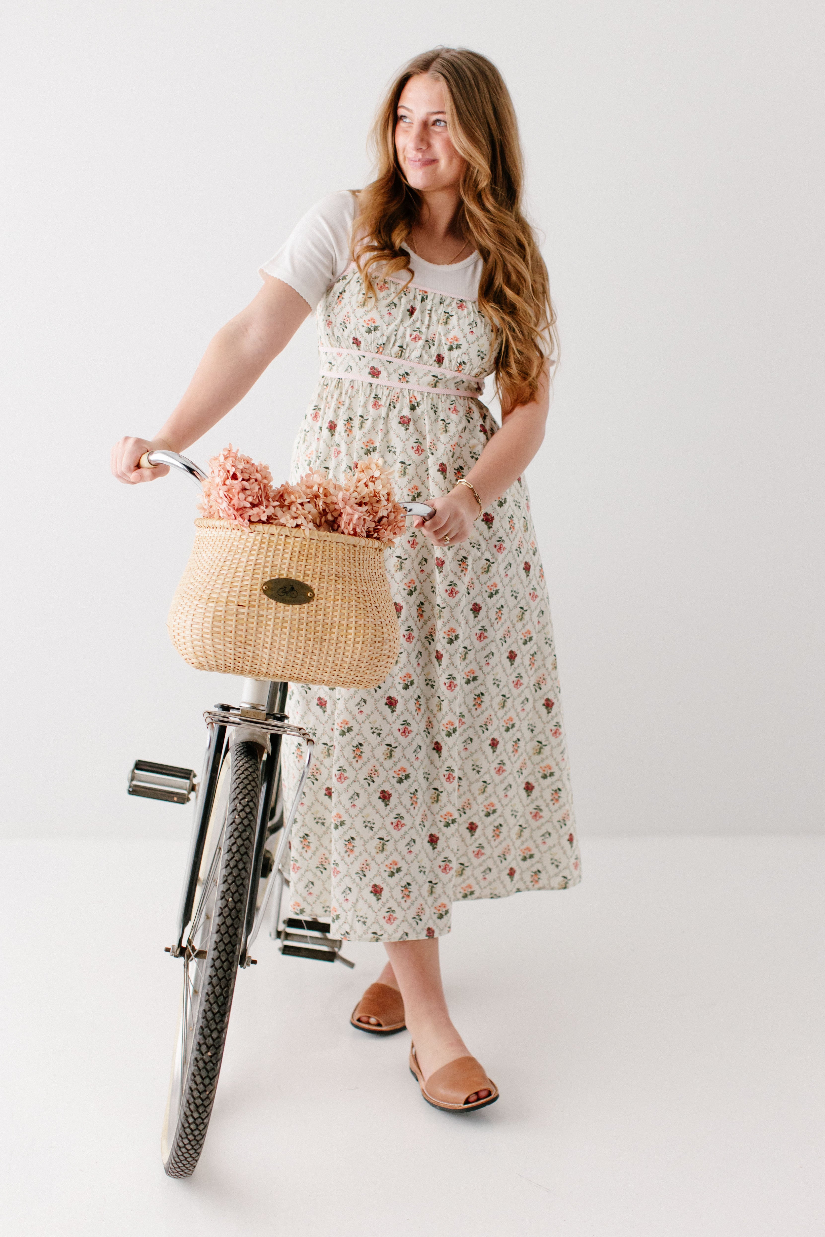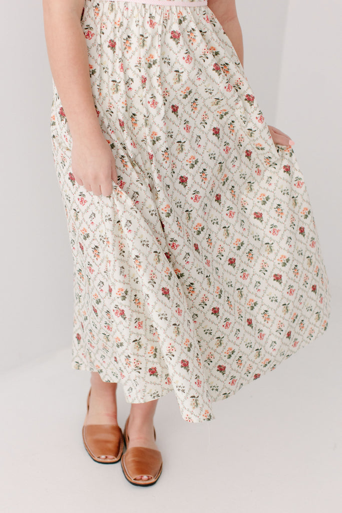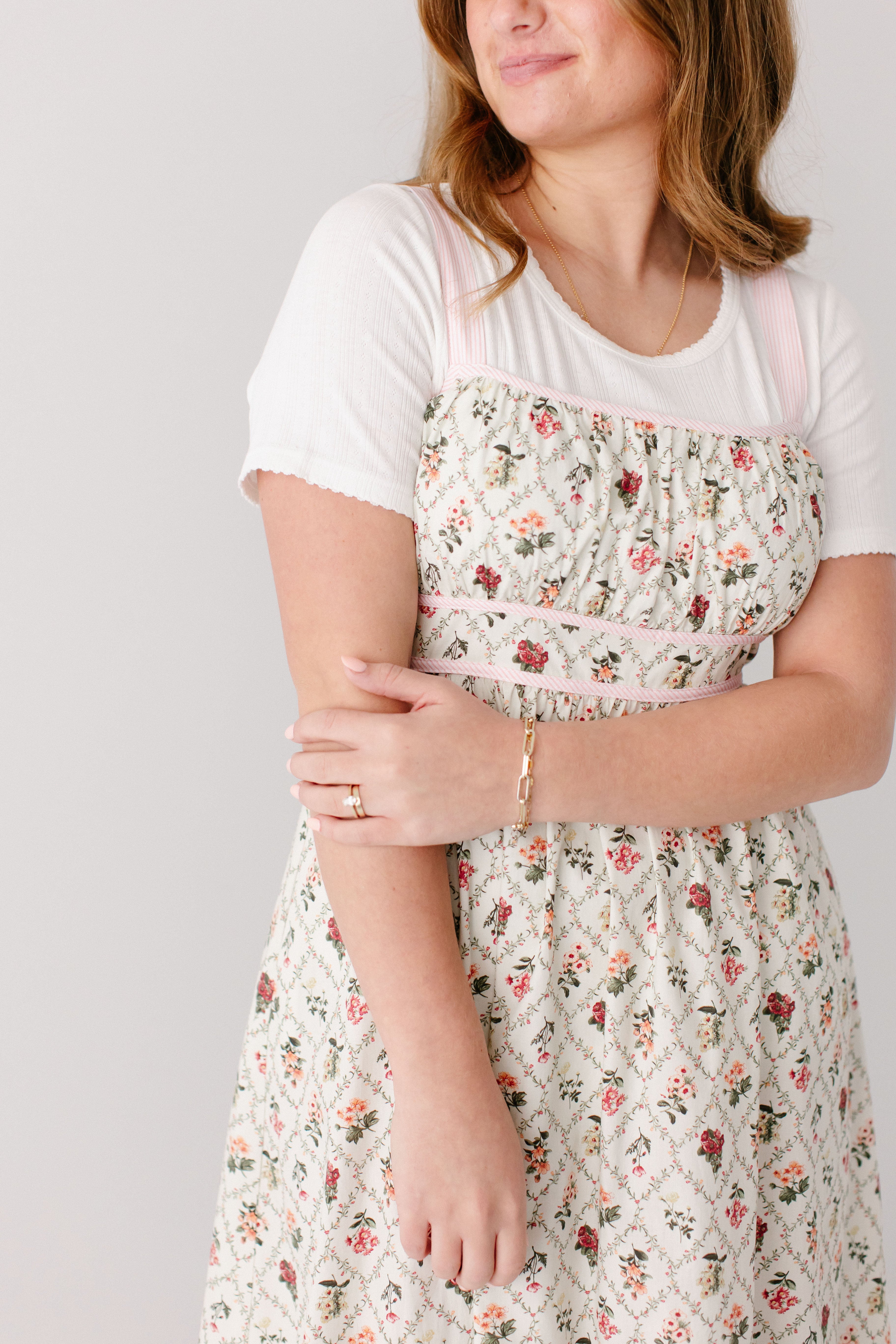 Model wearing the 'Mia' Pointelle Knit Top in Soft White layered under the 'Wildflower' Floral Pinafore Maxi Dress