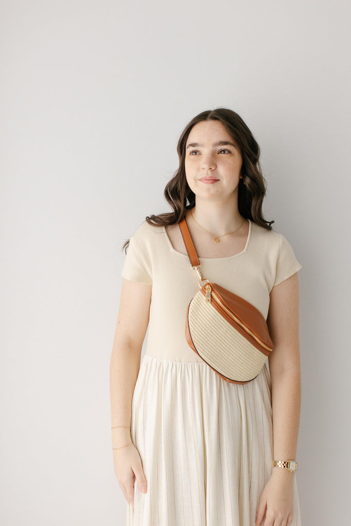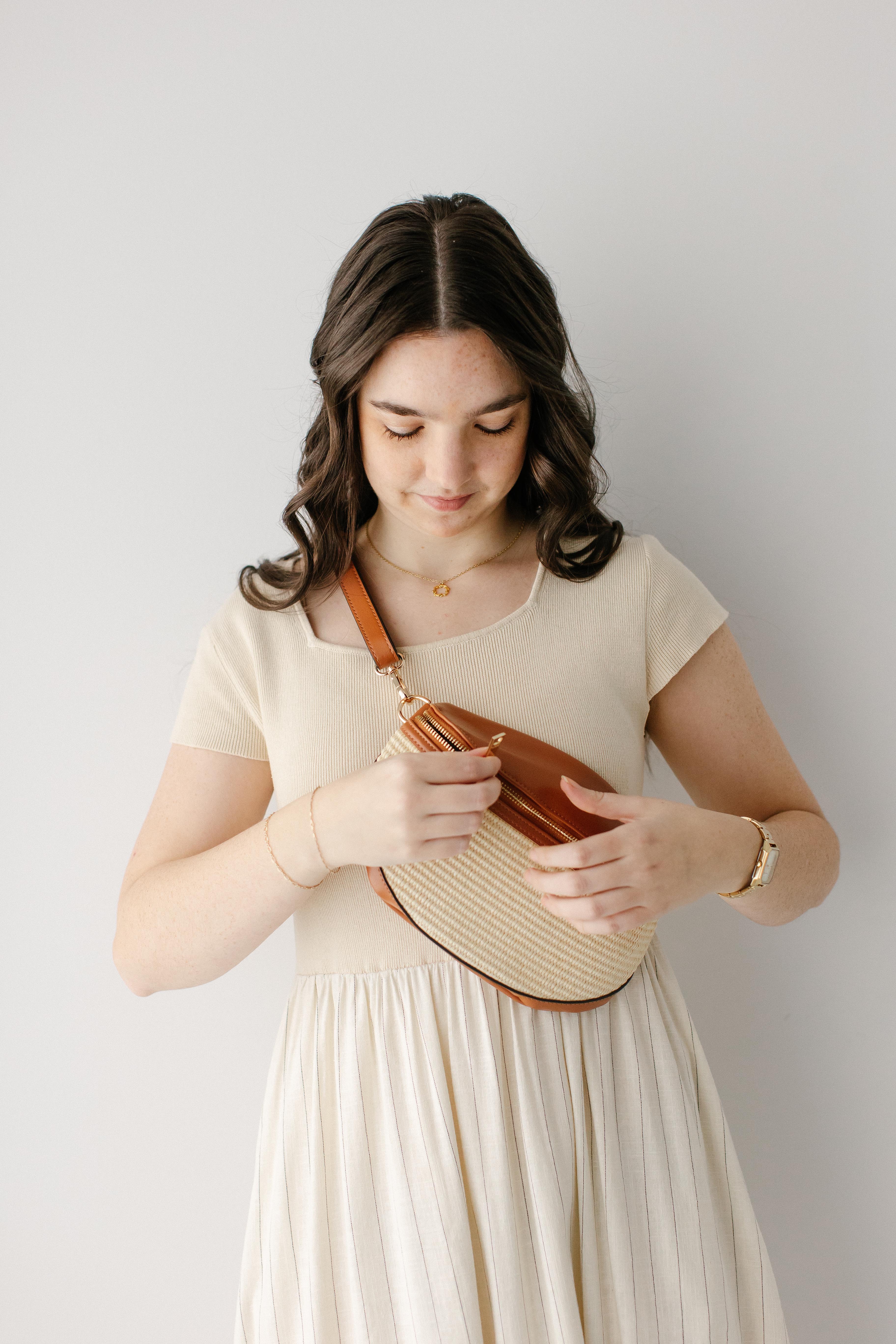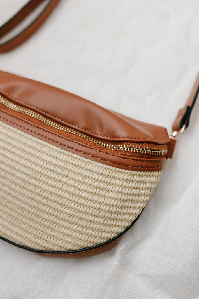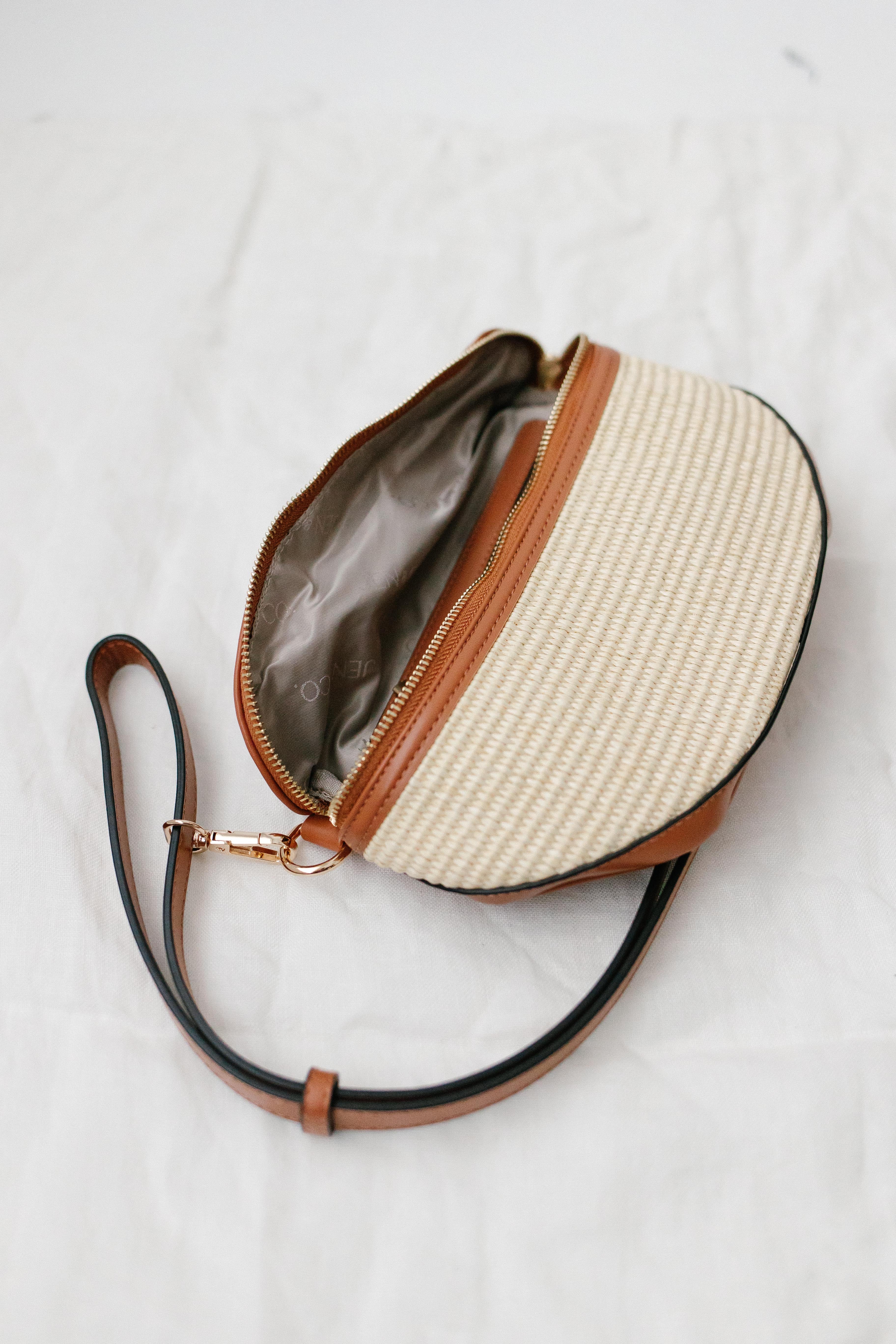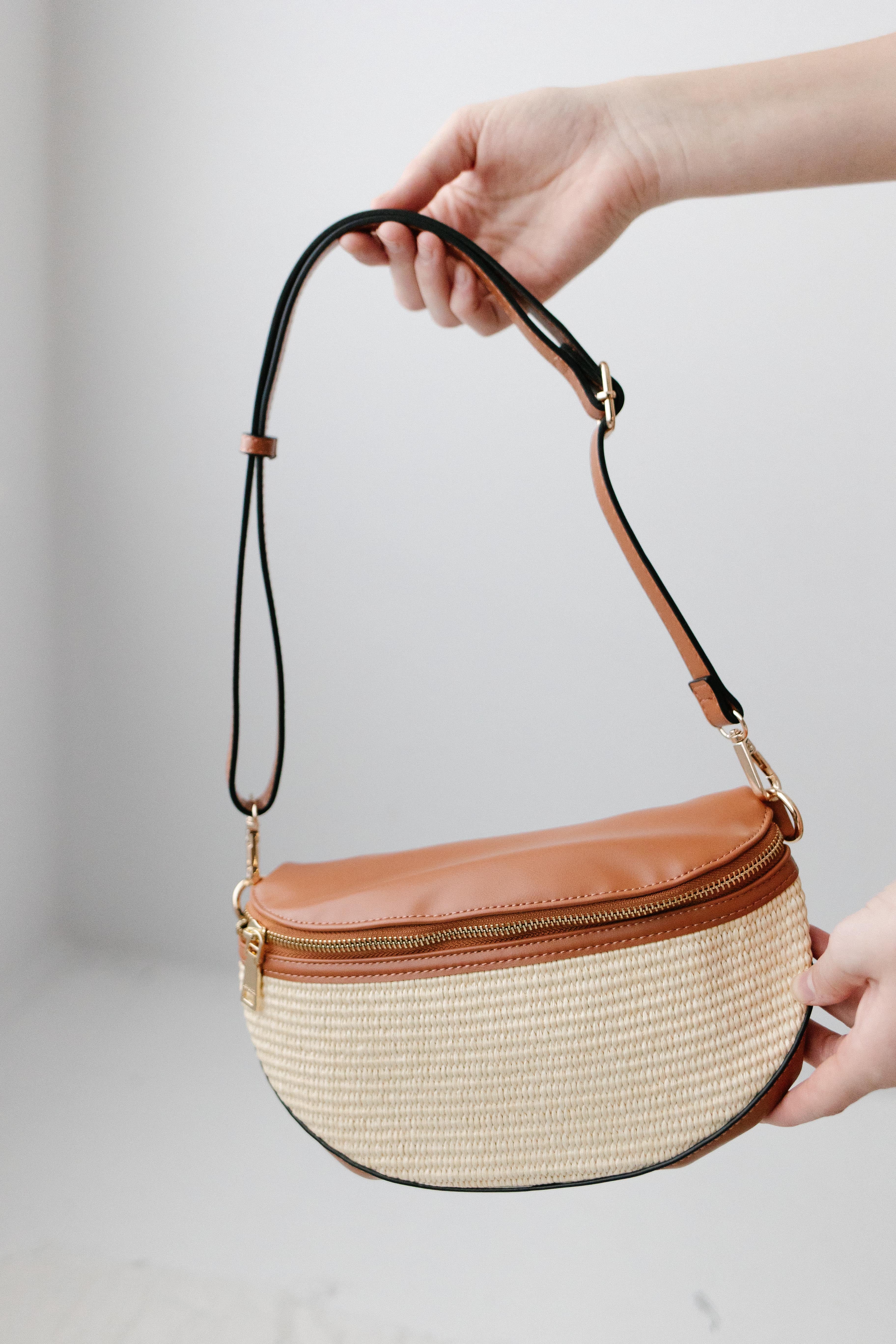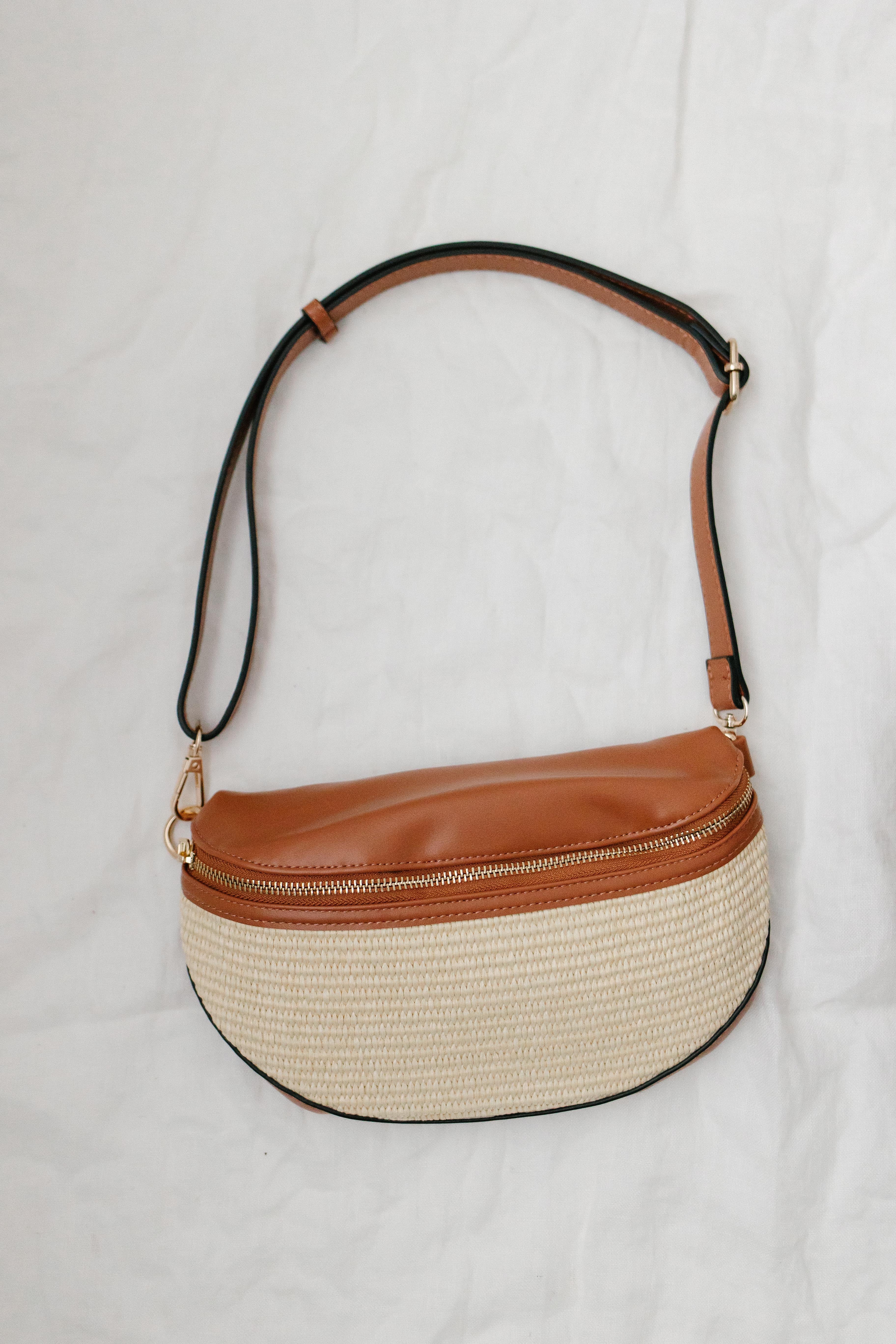 This woven crossbody belt bag is made with vegan leather and features a woven design on the front. It also features a removable strap, perfect for pairing with any of your vacation outfits!