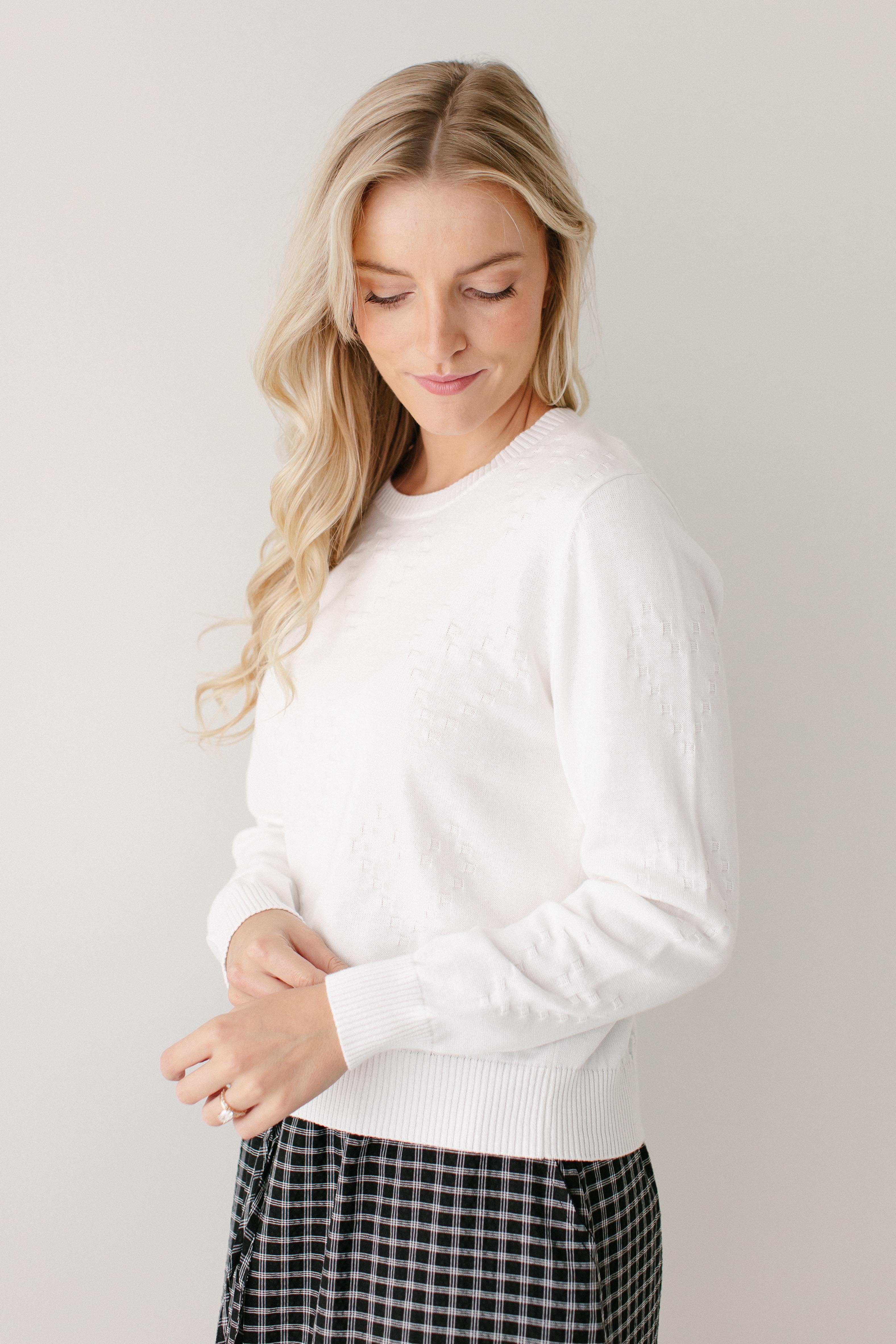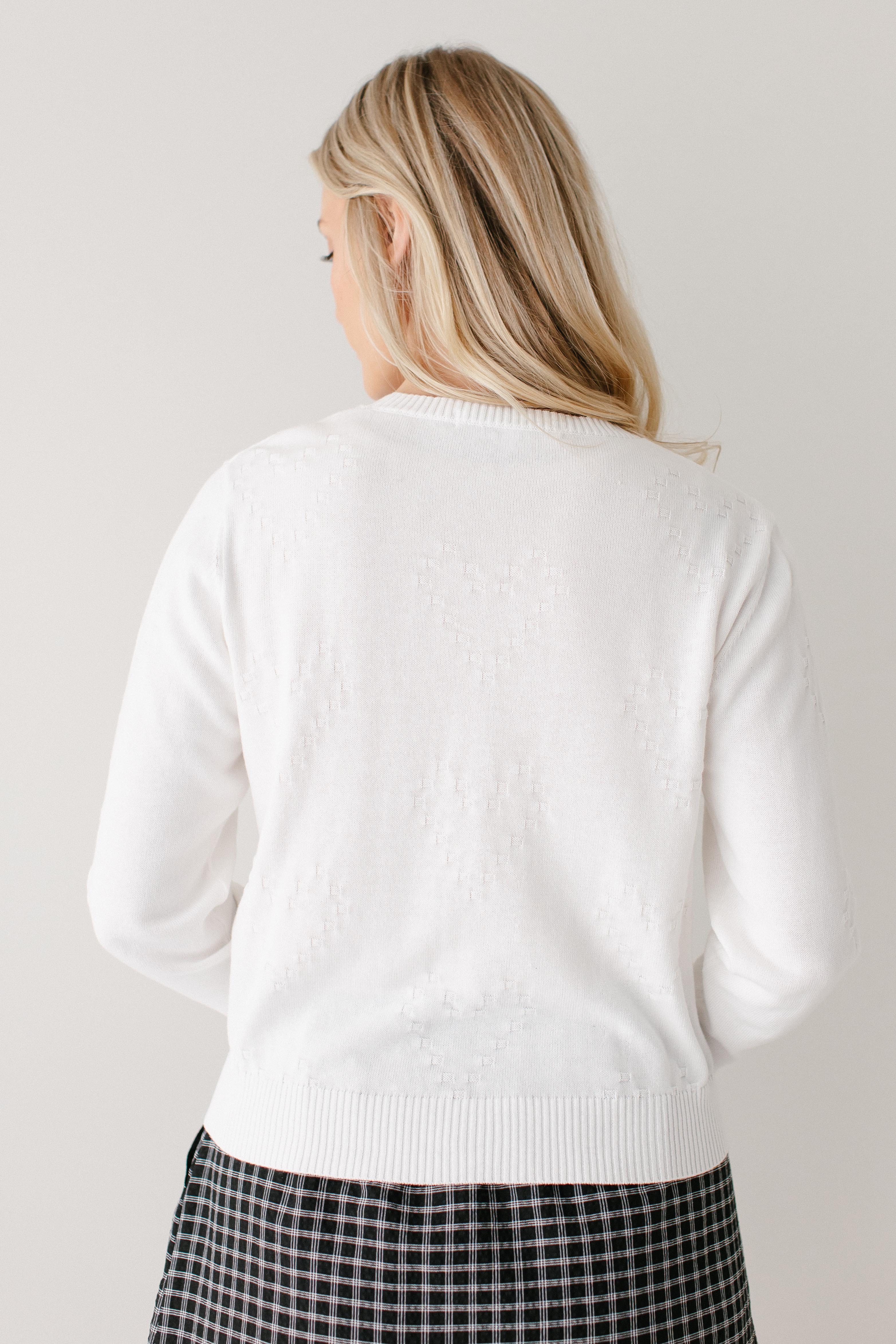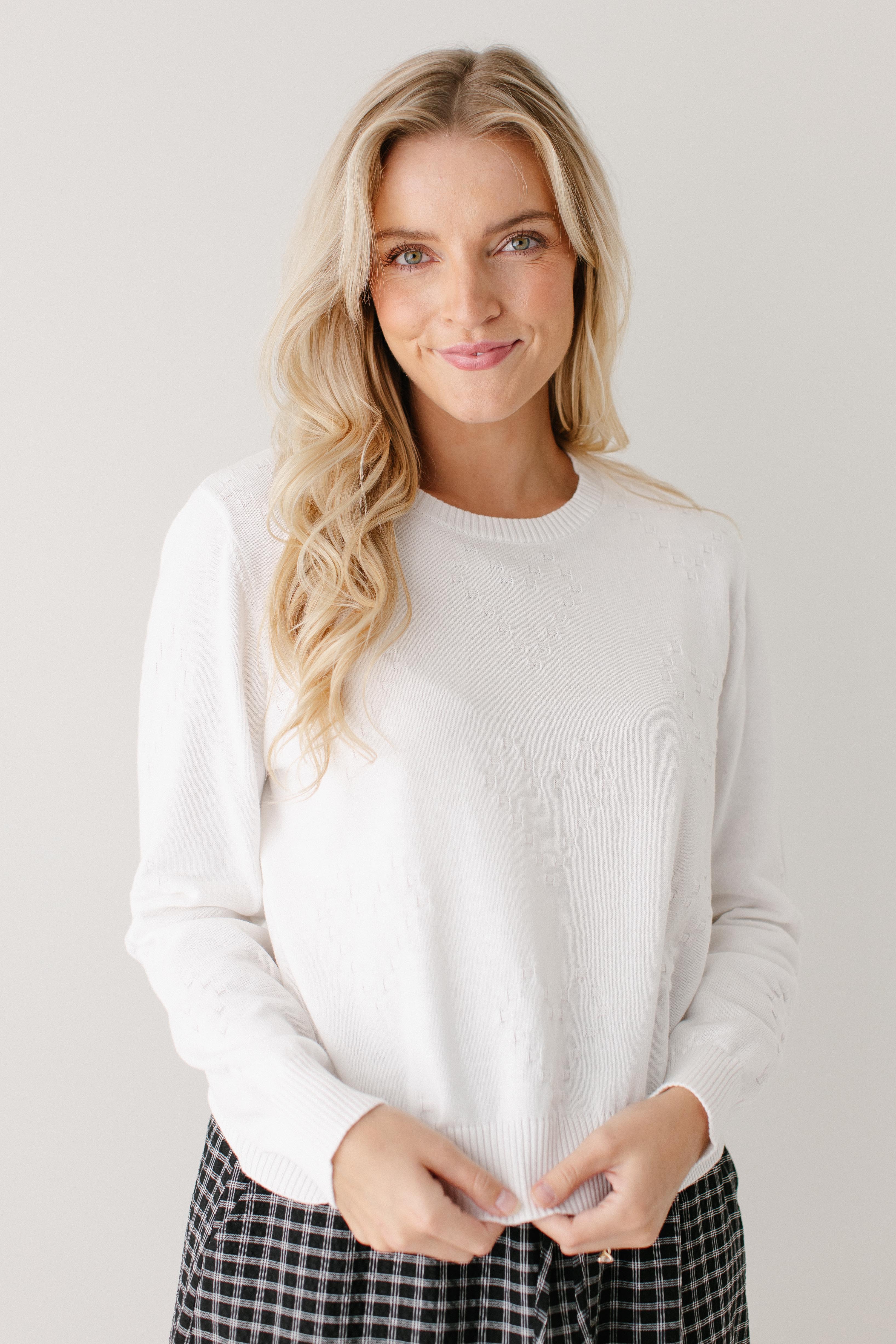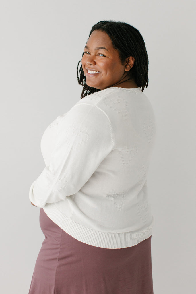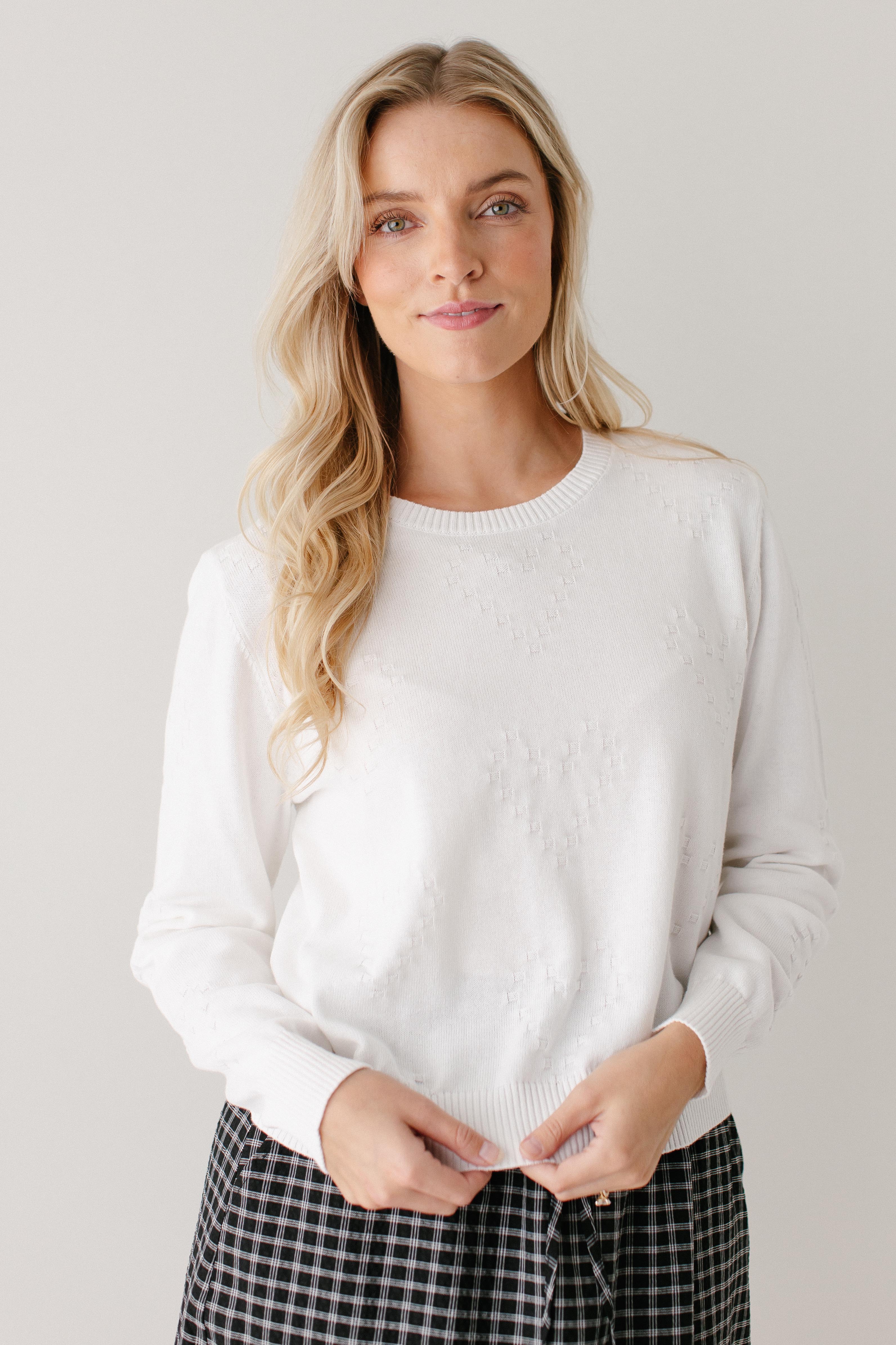 Meet the sweetest, most feminine sweater you are sure to love! The Woven Heart Sweater is made from 100% cotton in the most beautiful ivory color with a woven heart detailing on the front and back. This is the perfect sweater to pair with all of your favorite skirts, whether they are knit, denim, or printed! Exclusively designed by us with you in mind.