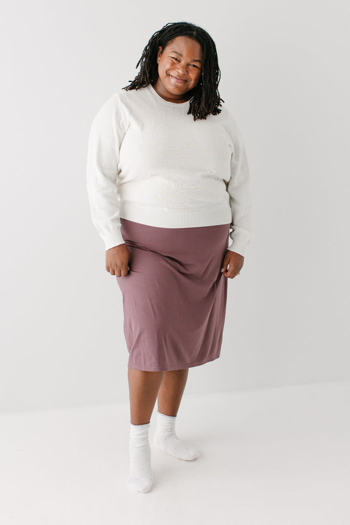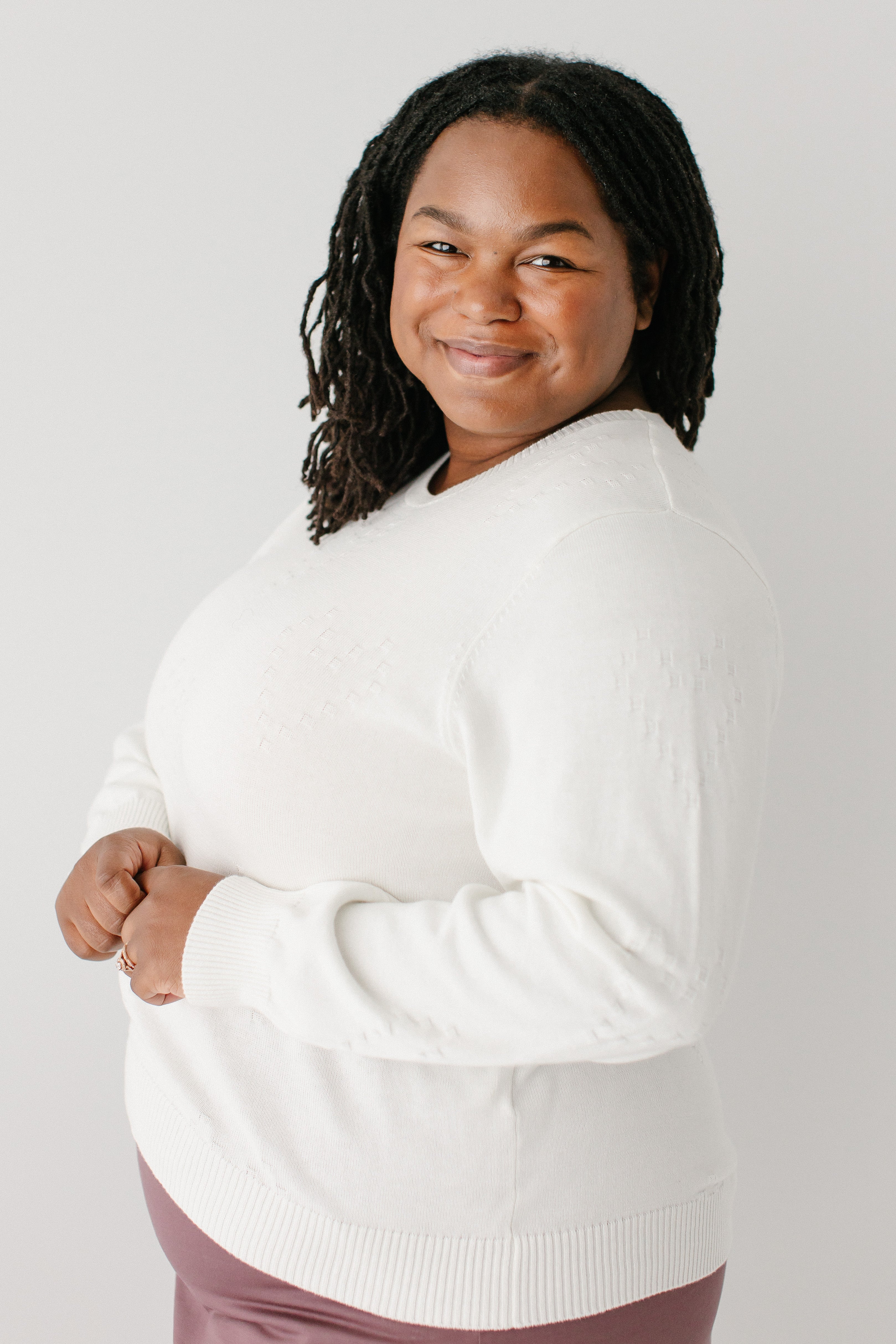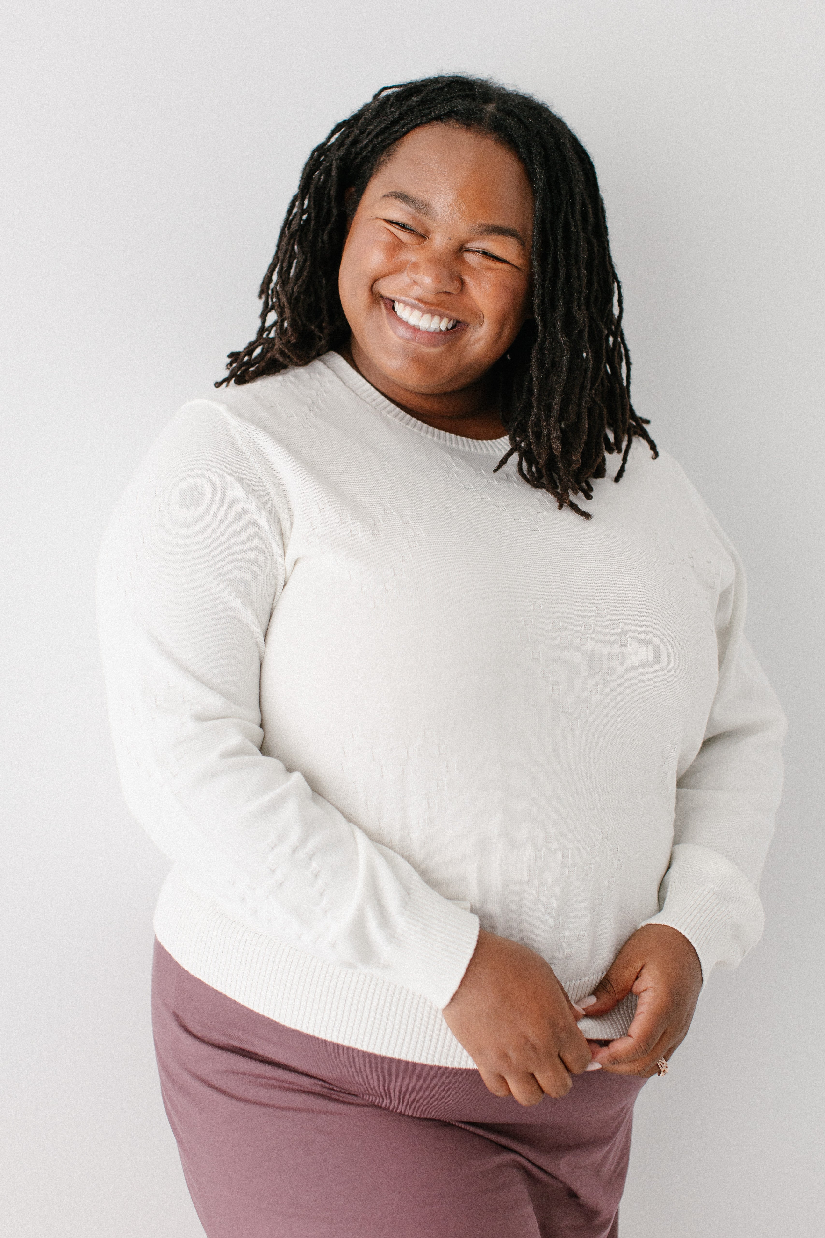 Model wearing the Woven Heart Sweater in Ivory with the 'Zoey' Skort in Plum (coming soon!)